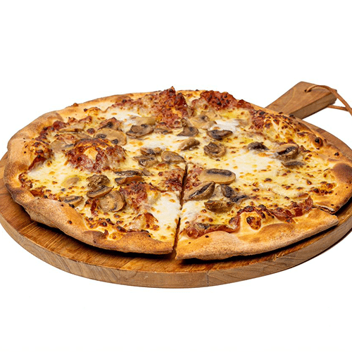 Mozzarella, coppa di parma, champignons, mozzarella en truffelolie. Dankzij de bereiding met origineel Italiaans spek heeft deze pizza een lekkere zoute smaak